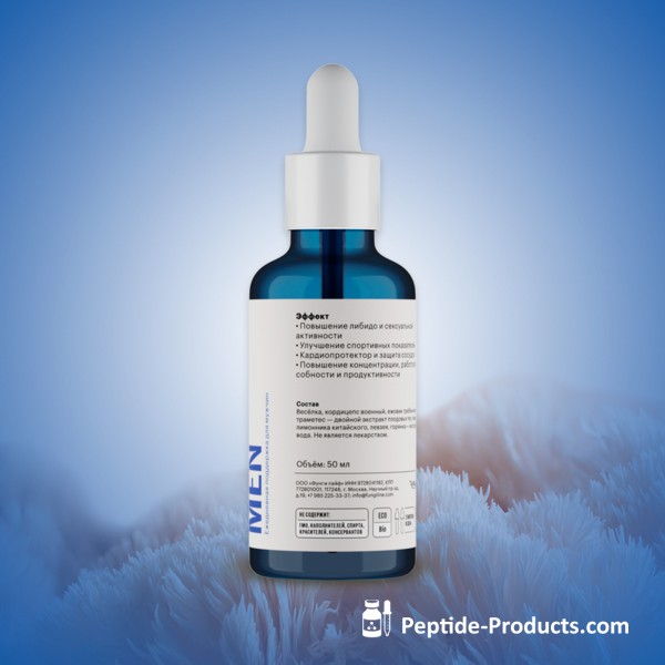 DAILY MEN LIQUID COMPLEX, developed by Mikhail Vishnevsky for comprehensive support of men's health. It contains medicinal mushrooms, plant extracts, and natural adaptogens that help maintain testosterone levels, increase endurance, improve cognitive function, and enhance overall well-being. The complex increases stress resistance and promotes physical and mental performance.